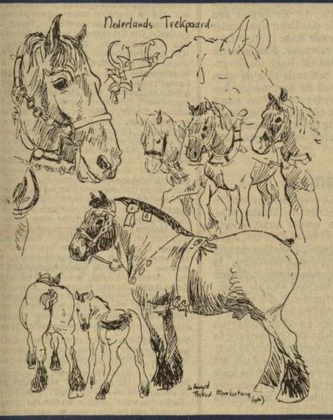 Dit zijn niet zomaar wat leuke tekeningetjes van een paardengek. Het zijn echte studies van karakteristieke eigenschappen in het voorkomen van een bepaalde paardensoort, in dit geval het Nederlandse trekpaard. Het blad maakt deel uit van de reusachtige documentatie die de Rotterdamse kunstenares Marleen Felius (29) bij elkaar heeft getekend en geschilderd op het gebied van groot- en kleinvee, waarvoor zij een grondige, systematische belangstelling heeft.