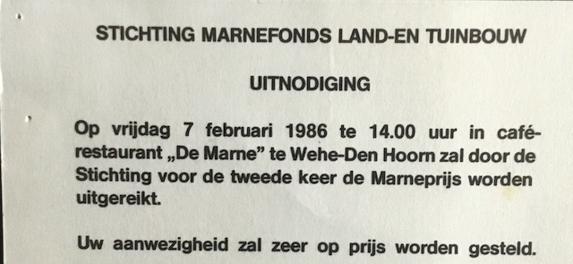 Vrijdagmiddag¹ heeft de Stichting “Marnefonds Land- en Tuinbouw” in Wehe-den Hoorn voor de tweede keer sinds haar oprichting de “Marneprijs” uitgereikt.