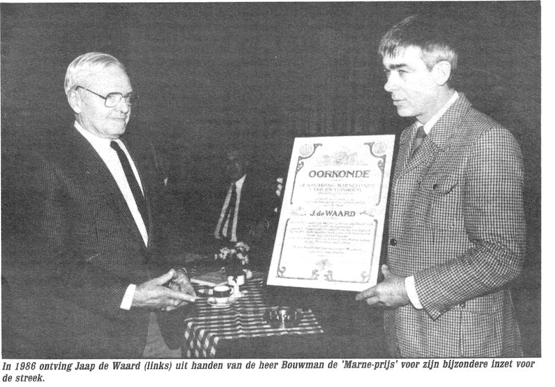 Hij vond, dat de heer De Waard ,,een speciale plaats in het Marnegebied had veroverd. Hoewel in de eerste plaats Uw werklust en inzet gericht was op Uw eigen bedrijf, heeft U zich altijd bezig gehouden en buiten Uw eigen erf lagen, maar indirekt daarbij wel betrokken.”