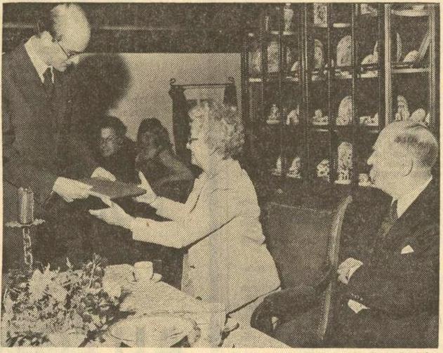 De heer Huizinga overhandigt het eerste exemplaar van het boek aan mevr. Smits. Rechts de heer Van Diepen.