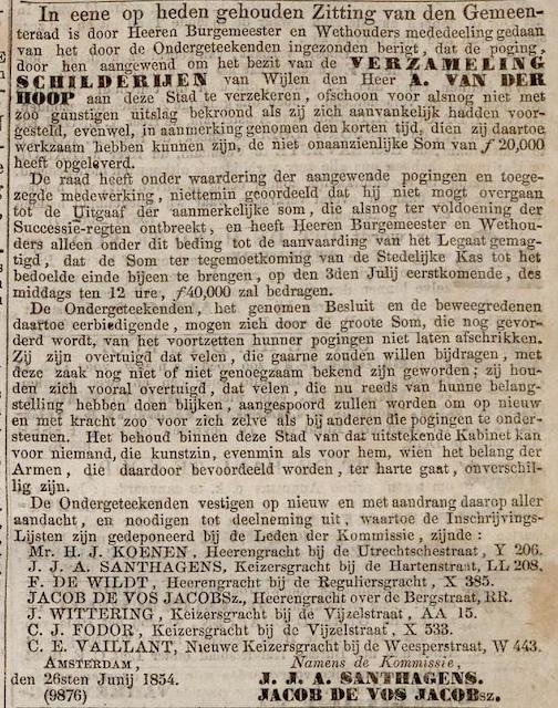 — Wij vernemen, dat wijlen de heer A. van der Hoop zijne kostbare verzameling schilderijen aan de stad Amsterdam heeft vermaakt met beding, dat de stad de successie-regten daarop vallende, uit eigen middelen betale, voor de verzameling zelve een behoorlijk gebouw inrigte en vervolgens voor een klein entrée-geld, ten voordeele der armen, laten bezigtigen. Bijaldien de stad mogt weigeren, dit legaat op de gestelde voorwaarden aan te nemen, zal het op de zelfde voorwaarden aan Teylers genootschap te Haarlem worden aangeboden, en mogt het ook hier worden geweigerd, dan zal de verzameling ten bate der erfgenamen worden verkocht.
