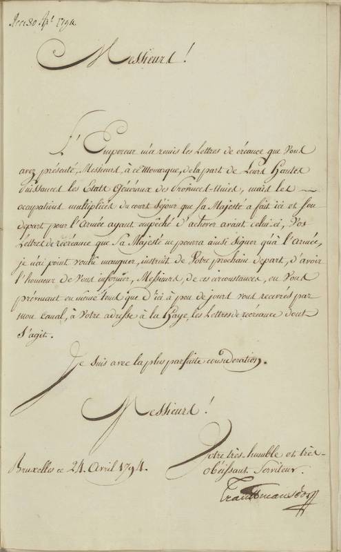 Voor ons vertrek hebben Wij van den Eersten Minister, den Grave van Trautmansdorff de hierbij geanexeerde Missive ontvangen, welke Ons heeft doen besluiten van niet naar de ontvangst der eigentlijke Recredentie Brief van Z. K. Majesteit ons vertrek uit te stellen, om zo doende niet verpligt te zijn van deze Commissie buiten noodzakelijkheid te verlengen; en Wij hebben in afwagting der voorsz. Brieven van Recredentie de eere van het gemelde Stuk bij dit Ons Rapport over te leggen, en Ons daar toe te gedraagen.