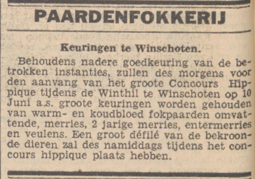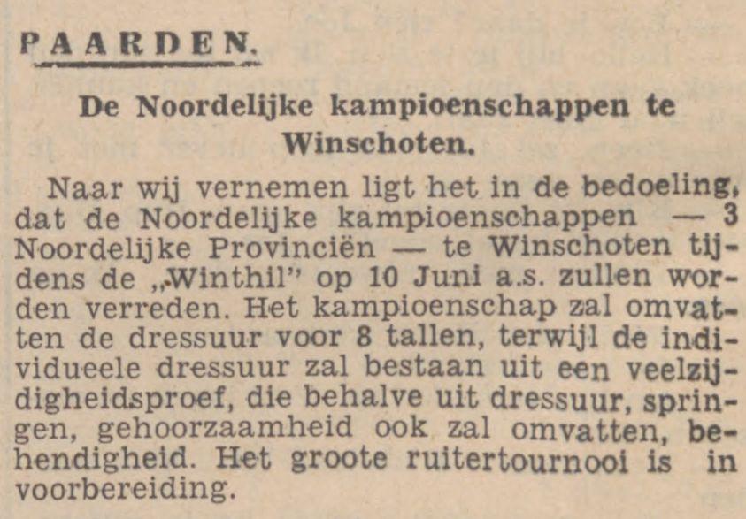 Zooals men reeds heeft kunnen lezen, zal er ter gelegenheid van de Winthil te Winschoten een zeer belangrijke paardendag worden georganiseerd. Voor de liefhebbers van de paardensport valt er op 10 Juni, want dat is de groote dag, te Winschoten zonder twijfel intens te genieten.