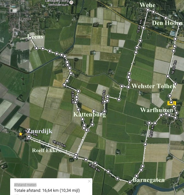 De route, ca 16,60 km, aangegeven op Google Earth. De route is voor 90% ongewijzigd.