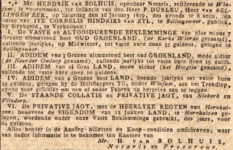 De door P. Durleu voor 16-01-1819 aangekondigde openbare verkoop is niet doorgegaan.