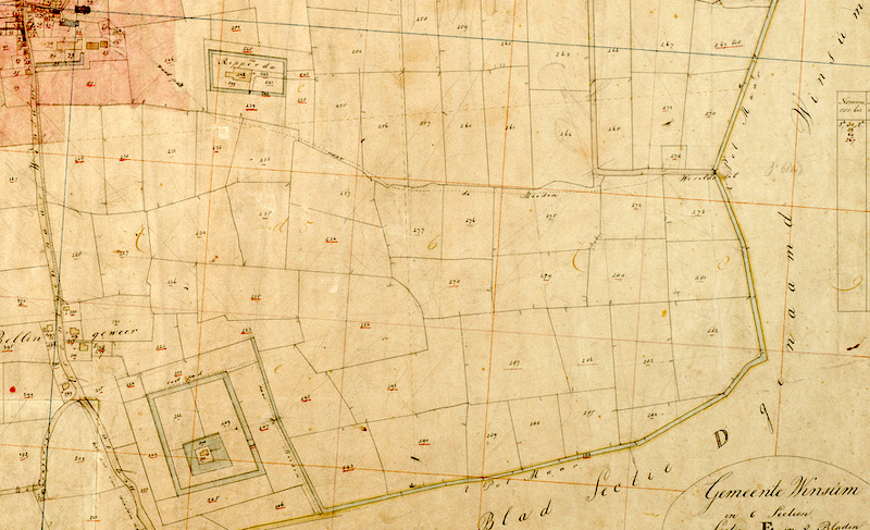 waarvan de uitvaart zal zijn op de ZuidWesterhoek van dit perceel over Numero twee en twintig; zijnde Speciaal bezwaard met het publiek voetpad en onderhoud van het vonder tusschen dit perceel en Numero vier en twintig liggende; ’t Welk bij eene eventueele verandering toch ten allen tijde zal moeten blijven en onderhouden worden, ten dienste van de perceelen Numero tien, Numero twaalf, Numero achttien, Numero twee en dertig, Numero vier en dertig, Numero zes en dertig, Numero twee en veertig, en Numero vier en veertig.