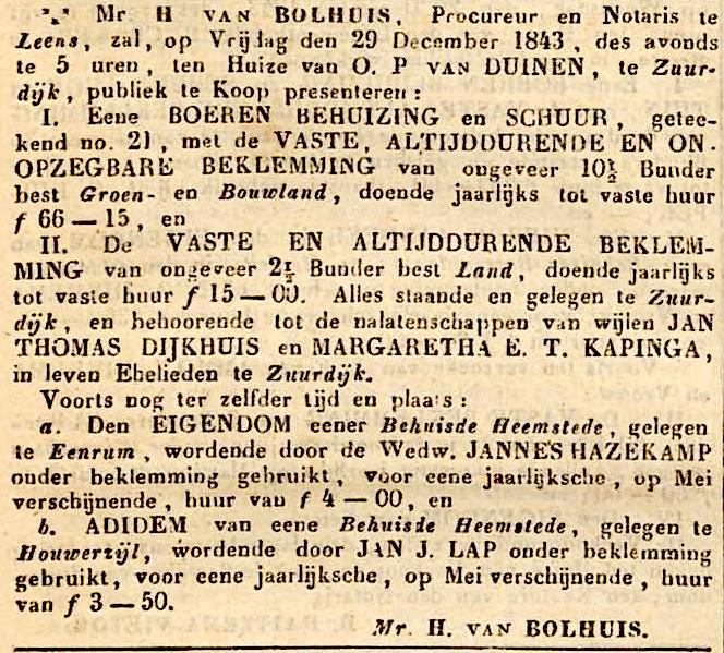 Numero een. Eene boeren behuizing en schuur, cum annexis, geteekent numero een en twintig, met de vaste, altijd durende en onopzegbare beklemming van derzelver erf, boomgaard en bijbehoorende bouw- en weilanden, te zamen, volgens de kadastrale opmeting, groot elf bunders, drie en vijftig roeden en dertig ellen, doende jaarlijks op midwinter aan de Diaconie der Roomsch-Catholieke gemeente op den Hoorn tot vaste huur zes en zestig gulden en vijftien centen, staande en gelegen te Zuurdijk, gemeente Leens, Arrondissement Appingedam, en aldaar in den legger van het Kadaster bekend onder Sectie G, nummers, 244 tot en met 254, 334 en 335.