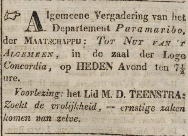 De heer M. D. Teenstra, onze landgenoot uit deze provincie, de eigenlijke grondlegger van dit Genootschap, opende deze vergadering en gaf te kennen: dat hij uit overtuiging van het nut, dat een Landbouwkundig Genootschap, behoorlijk gedirigeerd wordende, aan eene Kolonie gelijk deze zoude kunnen aanbrengen, het voornemen ter daarvan had opgevat en dien ten gevolge dit in de publieke nieuwspapieren had bekend gemaakt, met uitnoodiging aan allen , die daaraan deel zouden willen nemen, om daarvan aan den Uitgever van de Donderdagsche en Zondagsche Courant kennis te geven; dat hierop een aanzienlijk getal personen zich had opgedaan, die, benevens hem, daaraan werkzaam wilden zijn; dat hij derhalve verlof had verzocht aan de bestuurders van de Loge Concordia, om aldaar heden avond de gezamenlijke leden te mogen doen bijeenkomen, hetwelk hem gunstig was toegestaan geworden. Hij stelde al verder de wijze voor van oprichting, zamenstelling en instandhouding van een dusdanig Genootschap, met nadere omschrijving van de doelmatigste daaraan te verbindene werkzaamheden; gaande ten slotte bover met te betoogen, dat geene inrichting, van welken aard ook. zonder een behoorlijk bestuur, kan blijven bestaan, en te dien einde de gezamenlijke leden verzoekende, om een bestuur te verkiezen, aan hetwelk alsdan verder overgelaten zoude worden, om zoodanige maatregelen te beramen, als hetzelve nuttig en noodig zoude oordeelen.