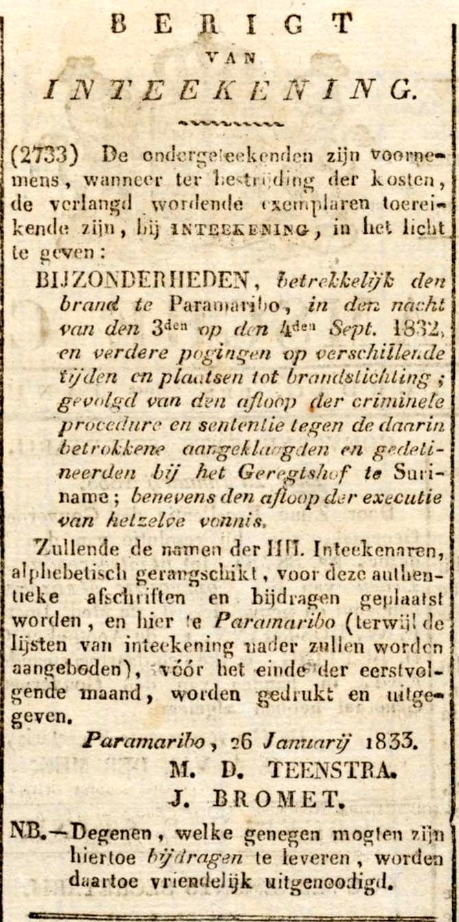 Marten Douwes Teenstra heeft de brand en de uitvoering van het vonnis beschreven in: Bijzonderheden, betrekkelijk den brand te Paramaribo, in den nacht van den 3den op den 4den Sept. 1832.