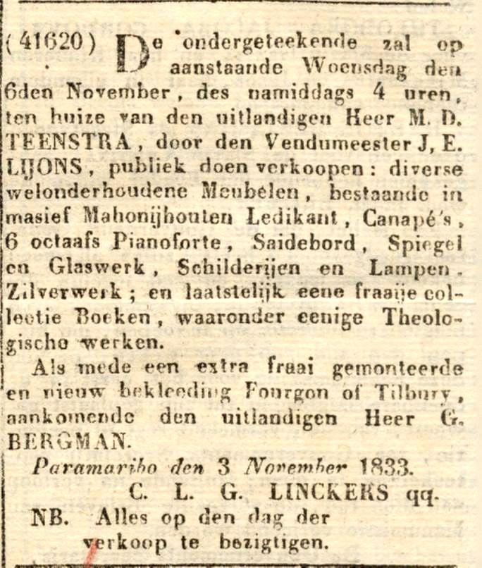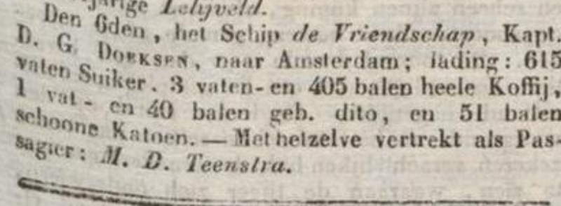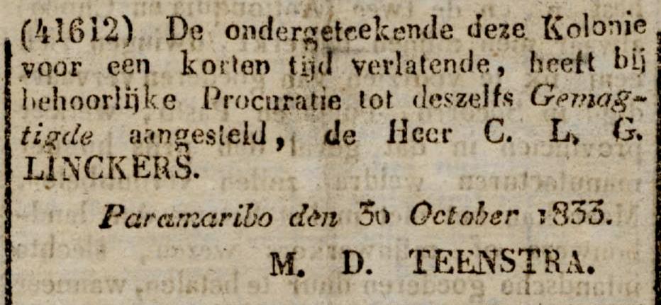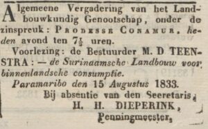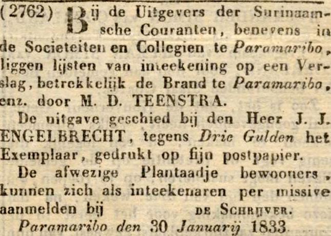Bij den Uitgever dezer Courant, is liggende, een breedvoerig berigt van Inteekening op een Werk getiteld: De Landbouw in de Kolonie Suriname, voorafgegaan door eene Geschied- en Natuurkundige Beschouwing dier Kolonie, in twee deelen, gr. 8 met Kaarten en Platen, door M. D. TEENSTRA.