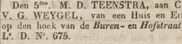 Den 21sten dito. M. J. Gelderlin, aan M. D. Teenstra, van het Huis en Erf op den Hoek van de Bure en Dwars-Hofstraten, La, D. N°. 675 []